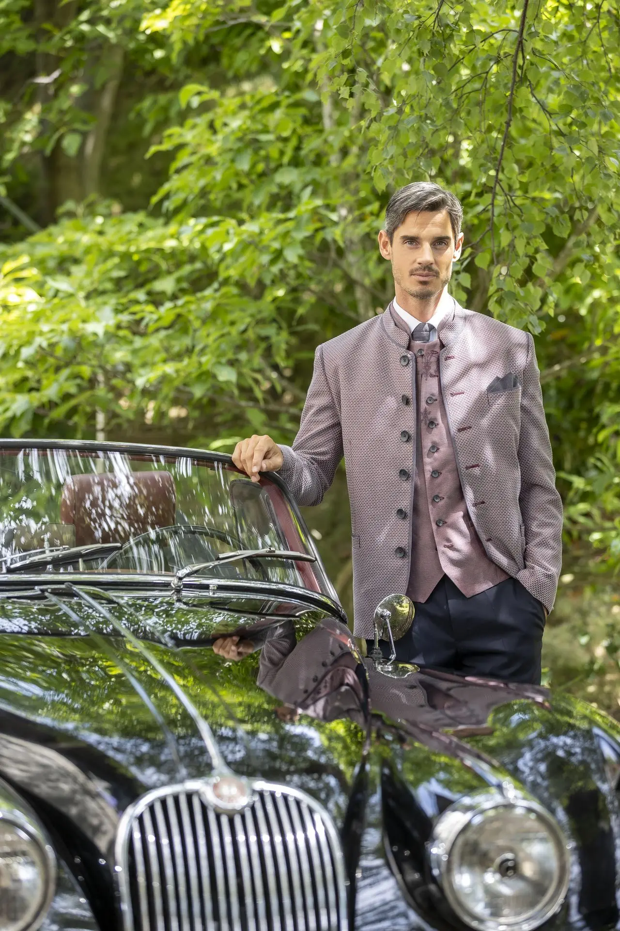 Auch die Herren überzeugen mit klaren Silhouetten, komfortablen Stretchqualitäten und edlen Jacquard-Gilets. Stilvoll, modern und unverkennbar Mothwurf.