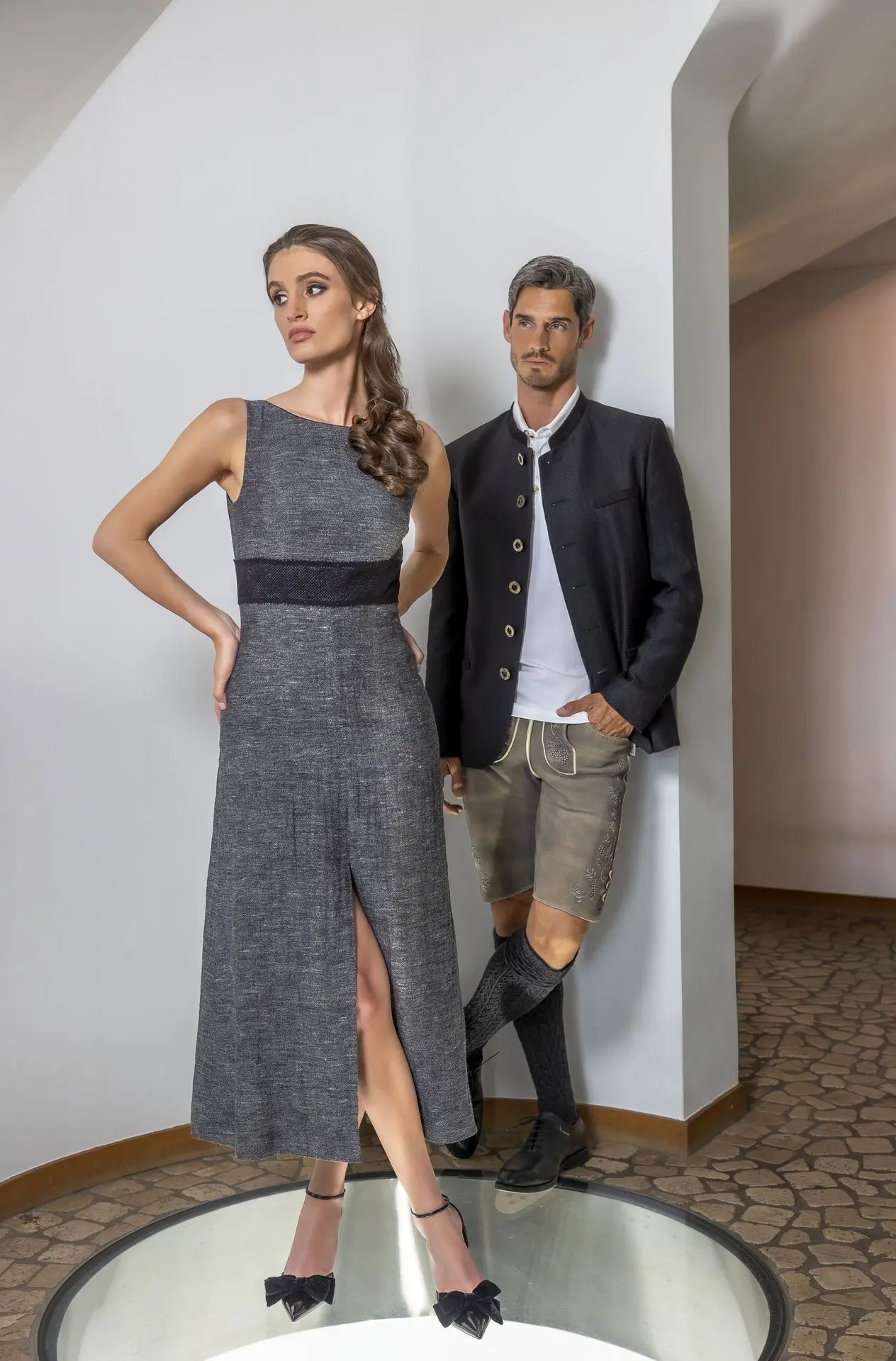 Tiefes Karmesinrot, royales Blau und jagdliches Olivgrün treffen auf moderne Schnitte, die Tracht neu interpretieren. Verführerische Mieder, edle Jacken und luxuriöse Outdoorteile bringen historische Anmut in die Gegenwart.